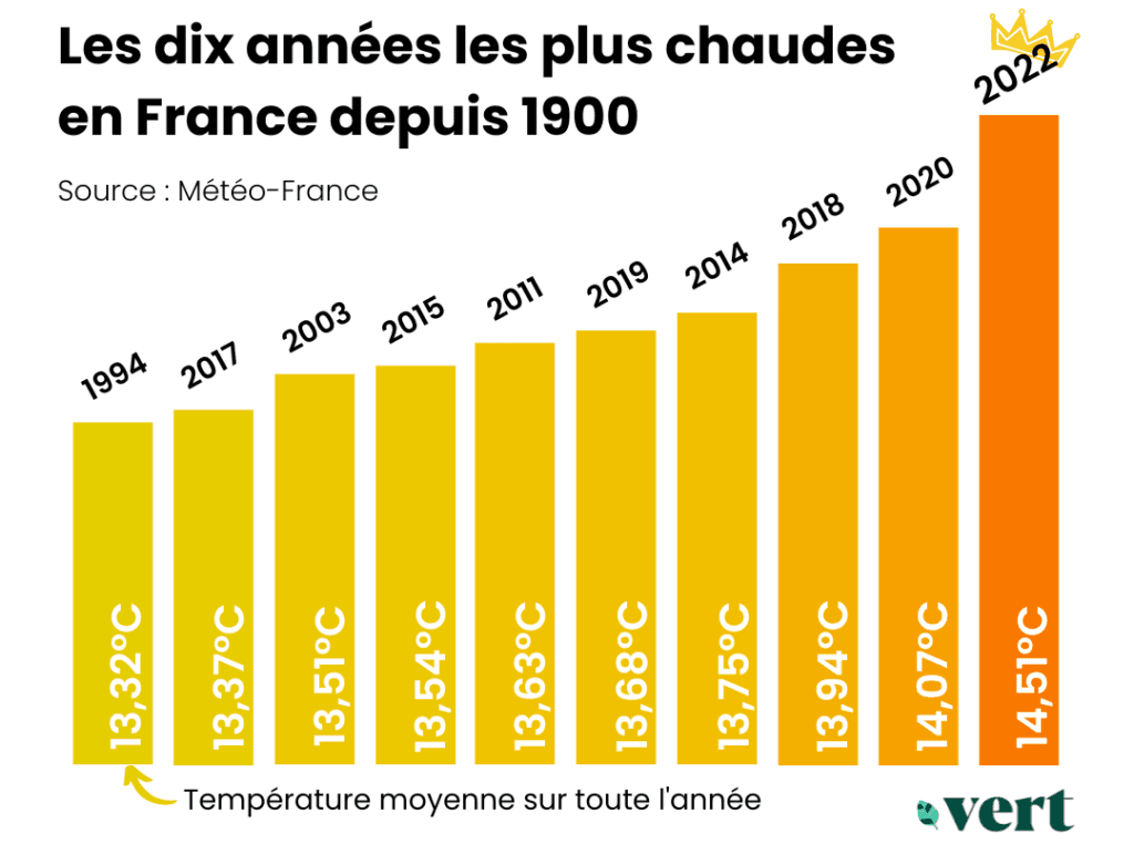 Top 10 des années les plus chaudes en France et températures moyennes associées - via vert.eco