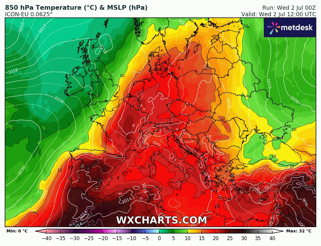 Masse d'air à 850 hPa (vers 1500m) du mercredi 2 au samedi 5 juillet 2025 - wxcharts.com