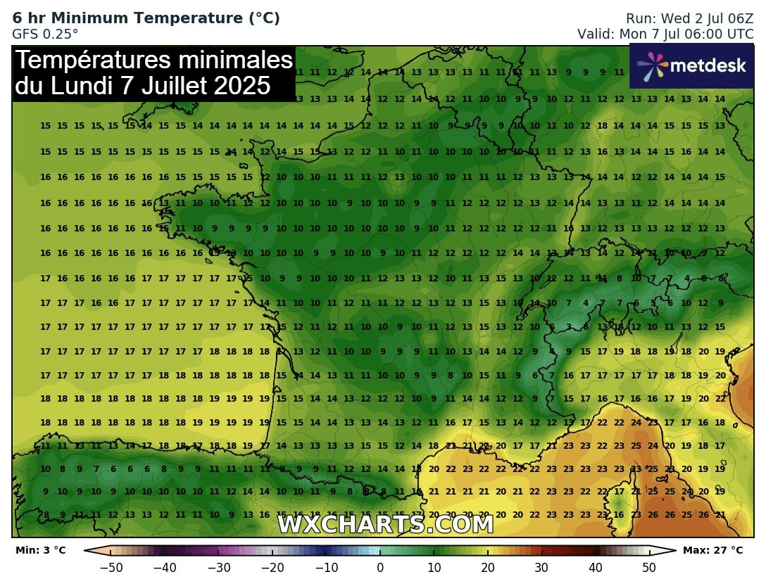 Températures minimales prévues le lundi 7 juillet 2025 - wxcharts.com