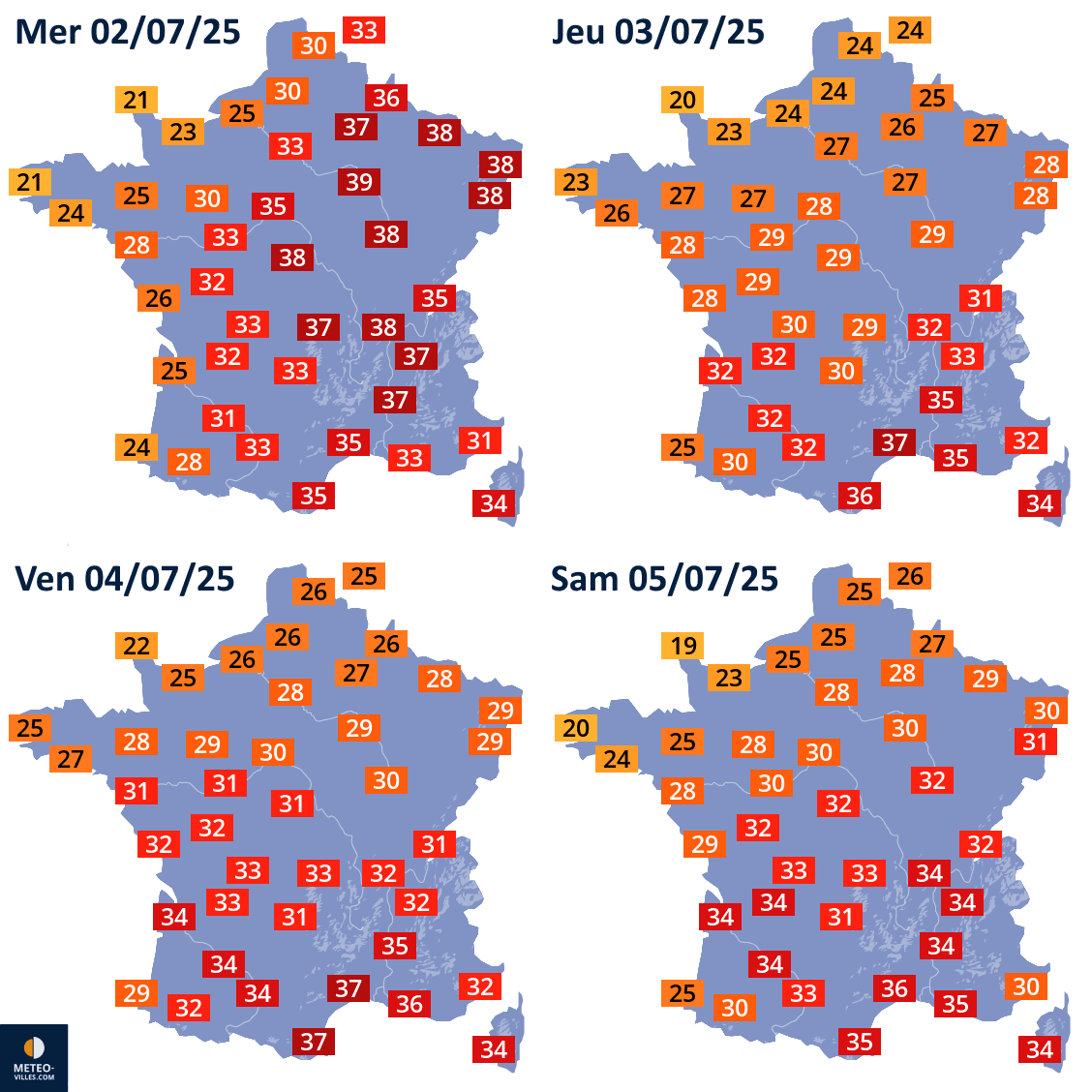 Températures maximales prévues du mercredi 2 au samedi 5 juillet 2025 - Météo Villes