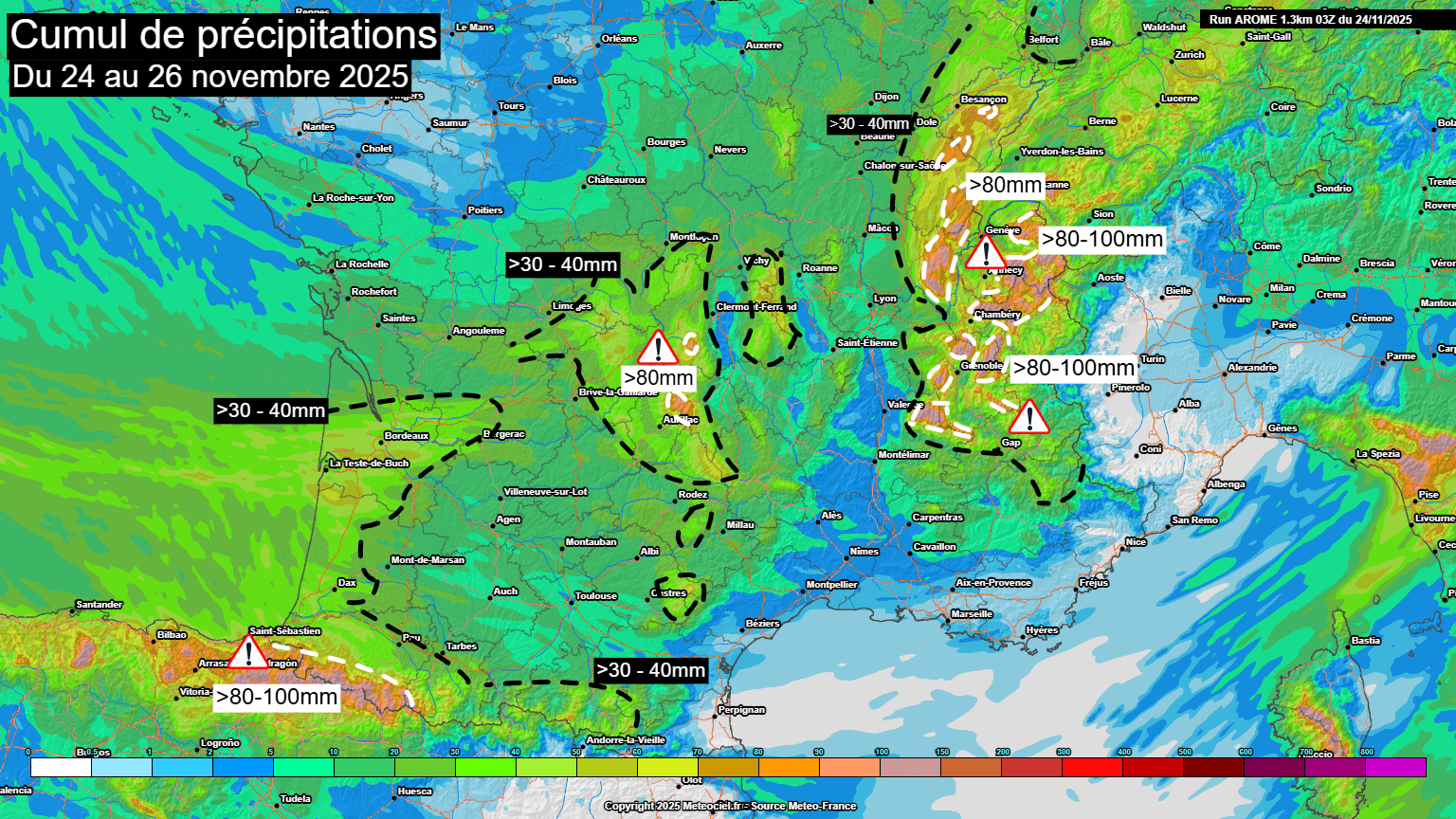 Ainsi, cet air très humide engendre de fortes précipitations sur une large partie sud de la France en ce début de semaine avec des cumuls prévus notables d'ici mercredi matin. Ain, Corrèze, Dordogne, Isère, Gironde, Haute-Savoie et Savoie sont d'ailleurs placés en vigilance orange Pluie-Inondation jusqu'à 00h ce soir.