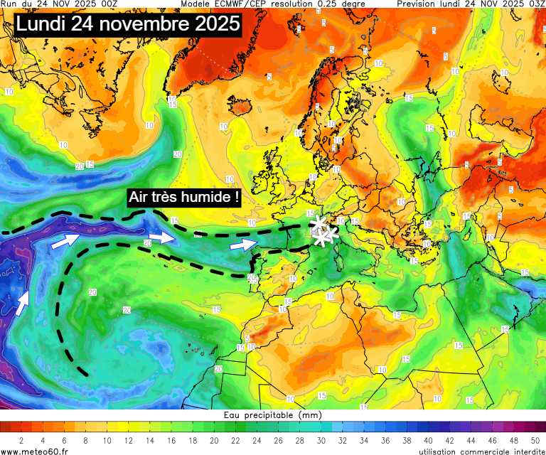 Air tropical très humide advecté vers la France ce 24 novembre 2025 – Carte : meteo60.fr