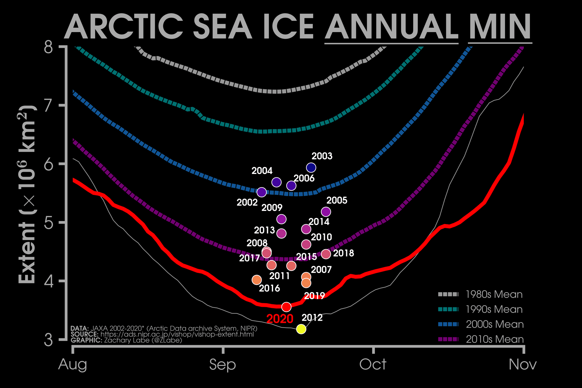 Minimum annuel d'extension des glaces (en million de km2) depuis 2002 - Zachary Labe