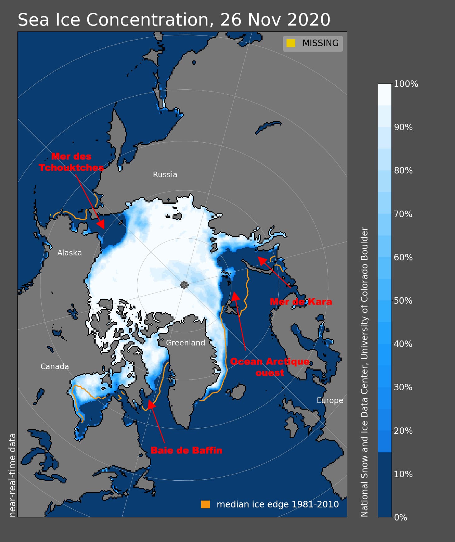Taux de concentration des glaces de l'Arctique au 26 novembre 2020 - comparaison à la moyenne 1981-2010 - NSIDC