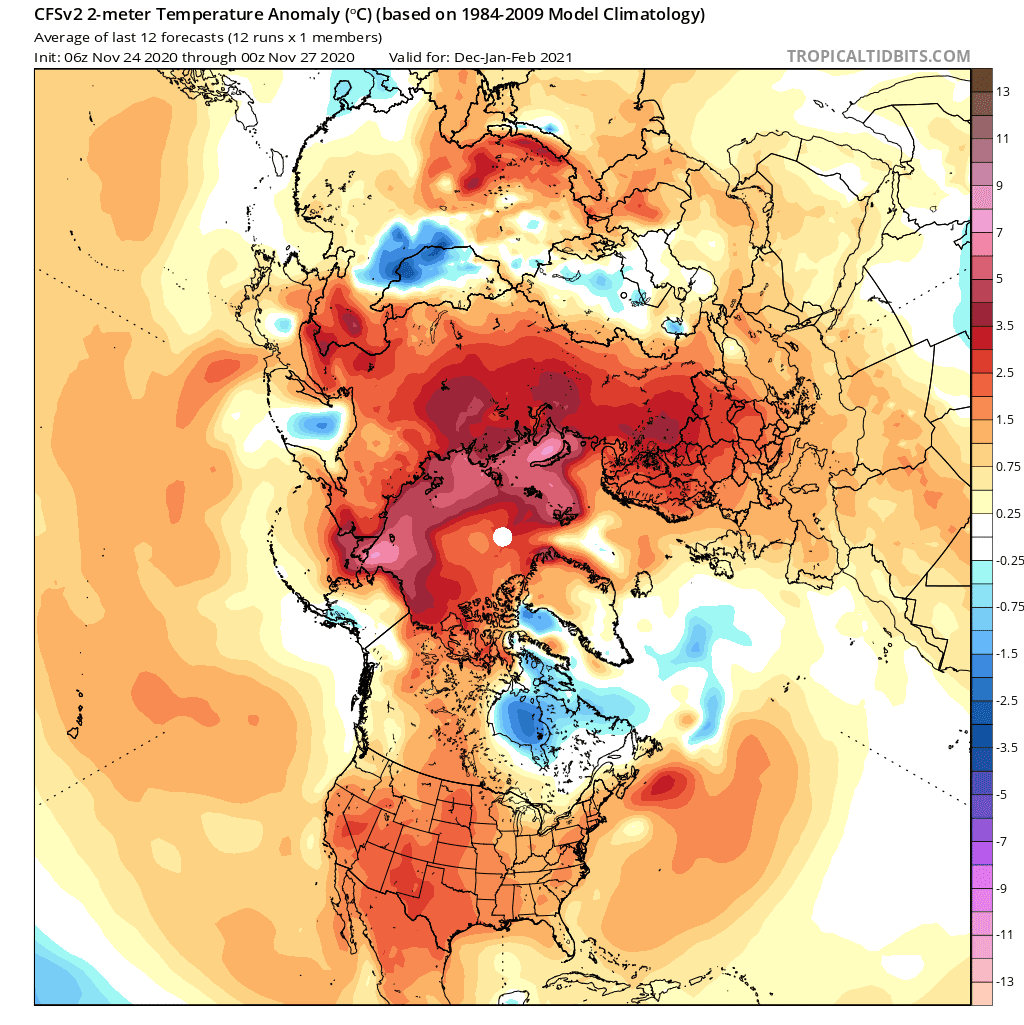 Tendance saisonnière hivernale (décembre-janvier-février) - anomalie de température prévue en °C sur l'Hémisphère Nord - Modèle CFS via Tropical Tidbits