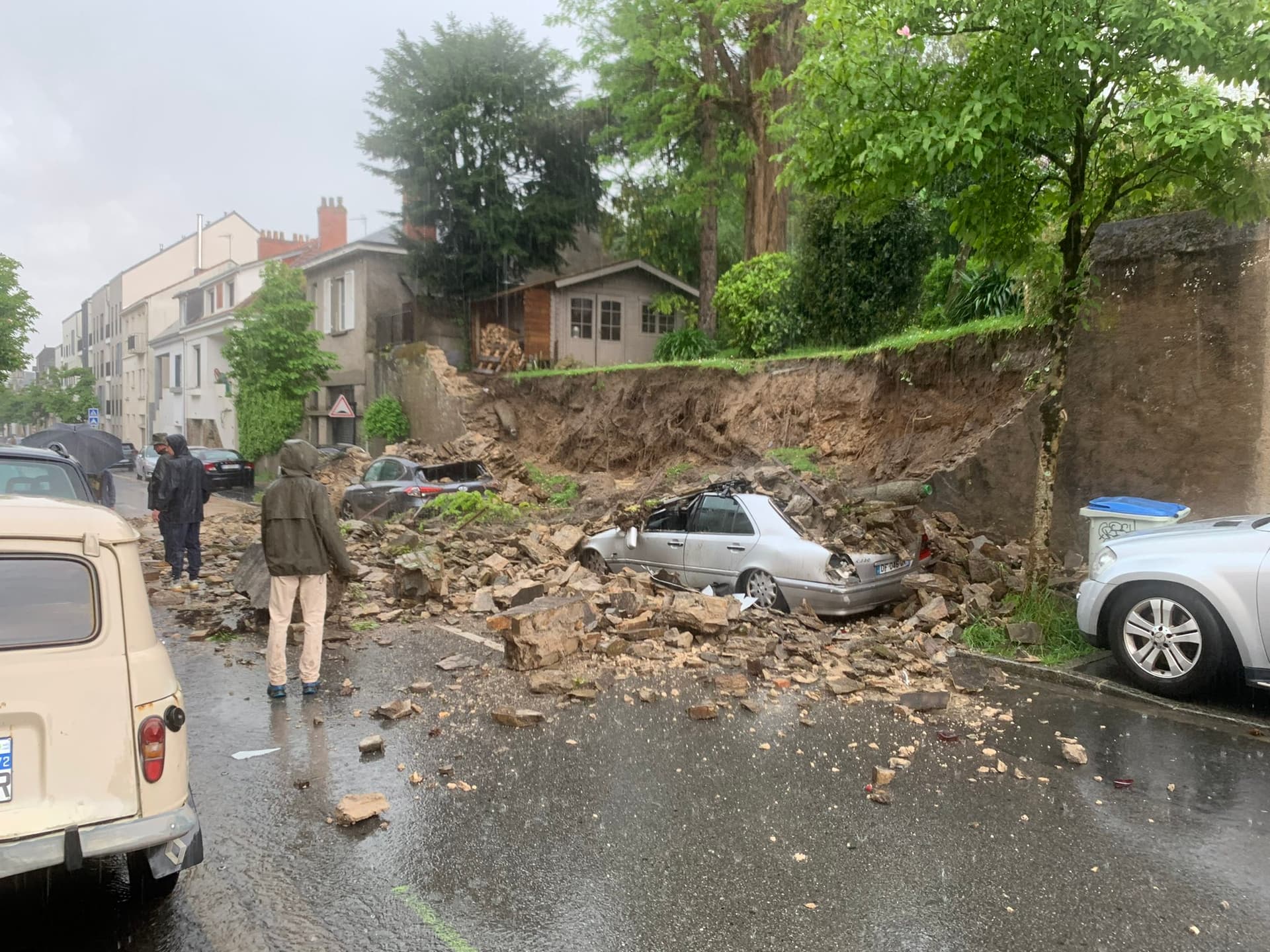 A Nantes, les fortes précipitations ont engendré quelques inondations locales et d'importants ruissellements. Un éboulement important a également été observé Rue Casimir Perrier, touchant plusieurs véhicules :