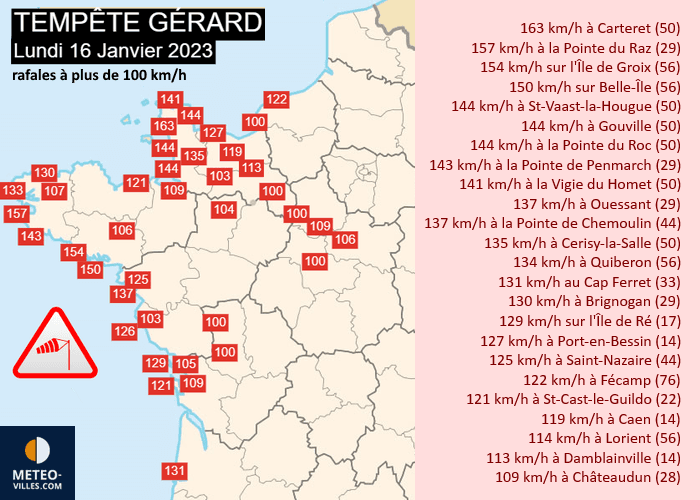Rafales maximales de la tempête Gérard le lundi 16 janvier 2023 - Météo Villes