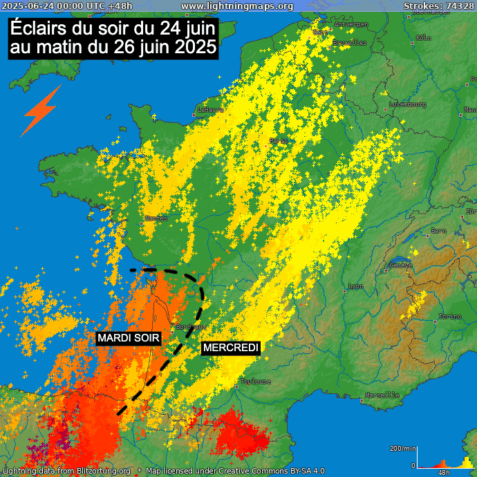 Éclairs détectés du soir du mardi 24 au matin du mercredi 26 juin 2025 - lithgningmaps.org