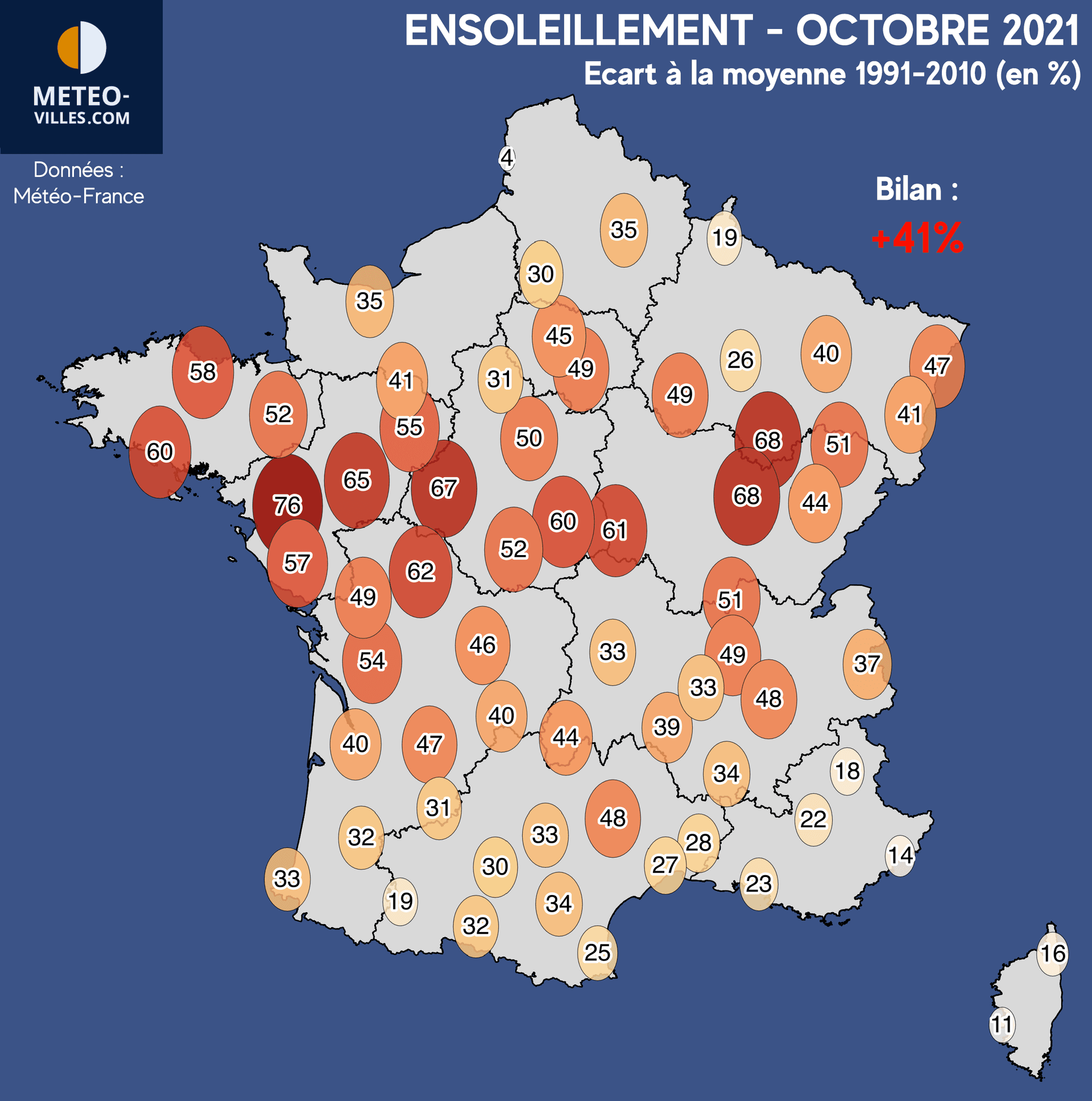 Pas une seule ville du pays n'aura vu moins de soleil que ce qu'il est habituellement espéré pour un mois d'octobre. Avec +4%, la ville du Touquet est celle qui présente l'excédent le plus faible. Outre le Nord-Pas-de-Calais, la Corse et les régions Provençales sont les seuls secteurs avec un excédent légèrement inférieur à +20% (+11% à Ajaccio, +14% à Nice, 16% à Bastia).