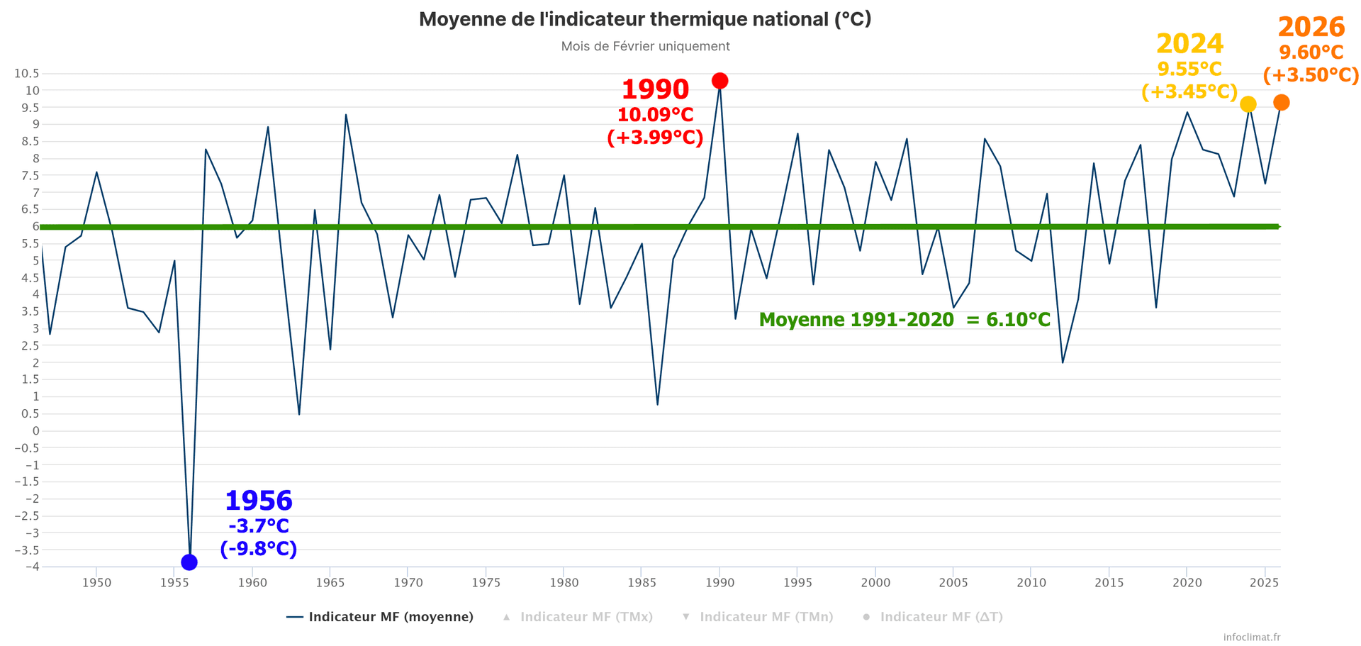 Moyenne de l'indicateur thermique national en février depuis 1946 - Infoclimat