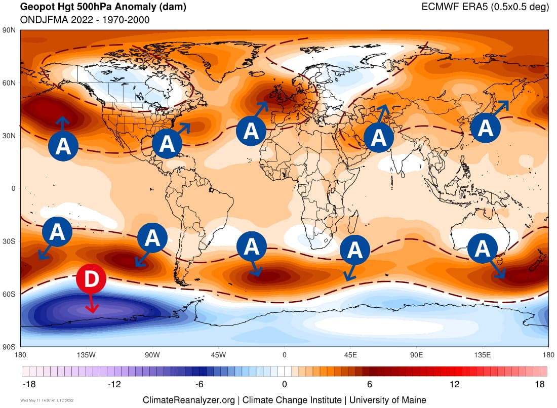 Anomalie de géopotentiels dans le monde de septembre à avril 2022 - via climatereanalyzer.org