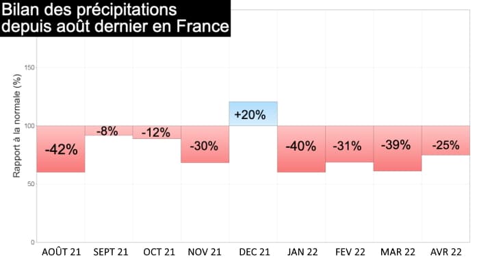 En France, cette remontée en latitude de la ceinture anticyclonique accentue l'effet de l'anticyclone des Açores sur notre climat. Elle favorise aussi la propagation des hautes pressions aux latitudes élevées, conduisant à la multiplication des situations de blocage. Cette observation est criante depuis la fin de l'été dernier où la pluie manque cruellement sur l'hexagone. D'août 2021 à avril 2022, 8 mois sur 9 ont enregistré des déficits pluviométriques, excédant les 30% de déficit sur 5 mois ! On peut ajouter à cette liste le mois de mai 2022 qui sera sans nul doute l'un des plus secs observés en France... La sécheresse devient un problème récurrent, y compris dans l'ouest et le nord du pays.