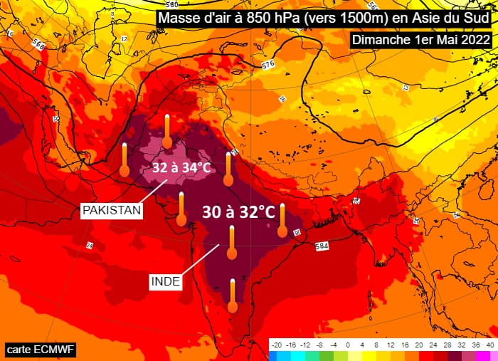 Masse d'air à 850 hPa (vers 1500m) en Asie du Sud pour le dimanche 1er mai 2022 - via ECMWF