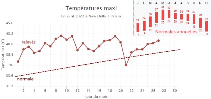 Températures relevées à New-Delhi (Inde) au mois d'avril 2022 - graphique infoclimat.fr