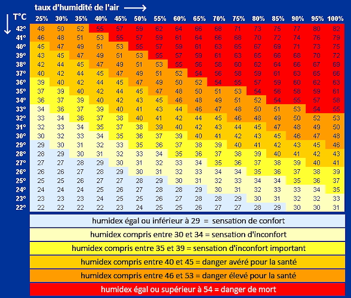 Pour jauger l'inconfort lié à la combinaison de la chaleur et de l'humidité, l'indice humidex a été créé. Comme il s'agit d'une valeur calculée et non mesurée, elle n'est associée à aucune unité (on indique jamais "degrés celcius" derrière une valeur d'humidex). Le tableau ci-dessous montre l'indice humidex en fonction de la températures relevée sous abri et du taux d'humidité de l'air. Ainsi, on constate qu'une température de 22°C sous abri associée à un taux d'humidité de 90% donne un humidex de 30, suffisant à créer de l'inconfort. À l'inverse, une température de 28°C sous abri sous un air sec ne contenant que 25% d'humidité donnera un humidex de 28, soit un ressenti plus agréable que dans le cas précédent !