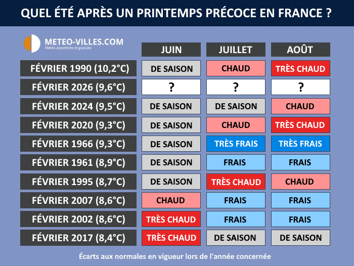 Le tableau ci-dessous liste les 10 mois de février les plus doux en France, avec février 2026 désormais classé au deuxième rang. Il permet de visualiser en un coup d'œil comment fut l'été qui a suivi. On constate rapidement qu'il n'y a aucune tendance qui se dégage. Si les mois de février 1990 et 2020 avaient été suivis par un duo juillet-août très chaud, ce fut le contraire en 1961, en 2002 ou en 2007, où la fraîcheur avait régné. Février 1966, deuxième mois de février le plus doux du XXème siècle, avait même été suivi par un duo juillet-août remarquablement frais (-2,9°C par rapport aux normales modernes) !