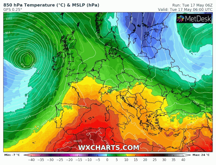 Masses d'air à 850 hPa (vers 1500m) du mardi 17 au lundi 23 mai 2022 - via wxcharts.com