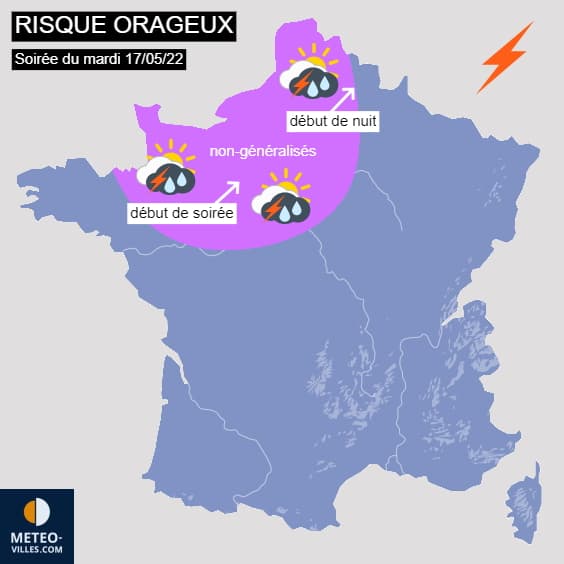En cette fin de journée, quelques cellules orageuses ont éclaté sur l'est de la Bretagne, le nord des Pays de la Loire et la Basse-Normandie. Ce mardi soir et jusqu'en début de nuit, elles vont progresser vers le nord du Centre, l'Île-de-France, la Haute-Normandie puis les Hauts-de-France. Ces orages ne seront pas généralisés mais pourront produire de fortes averses voire quelques chutes de grêle, bien qu'ils resteront d'intensité modérée la plupart du temps.