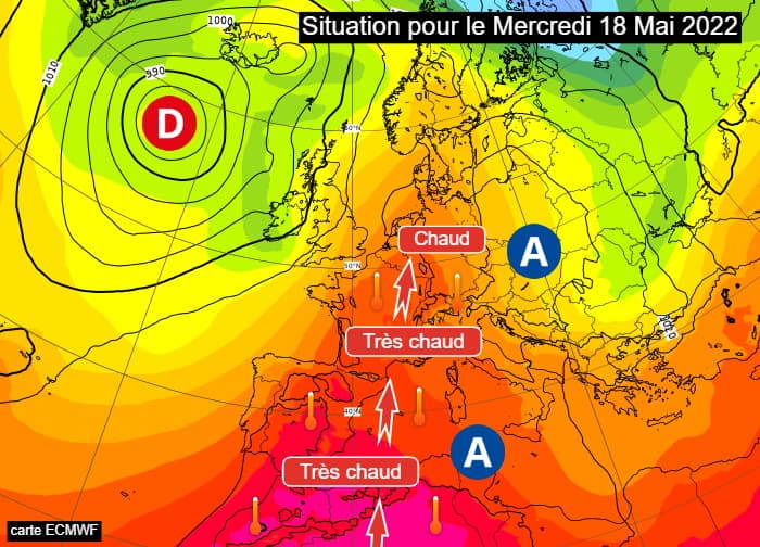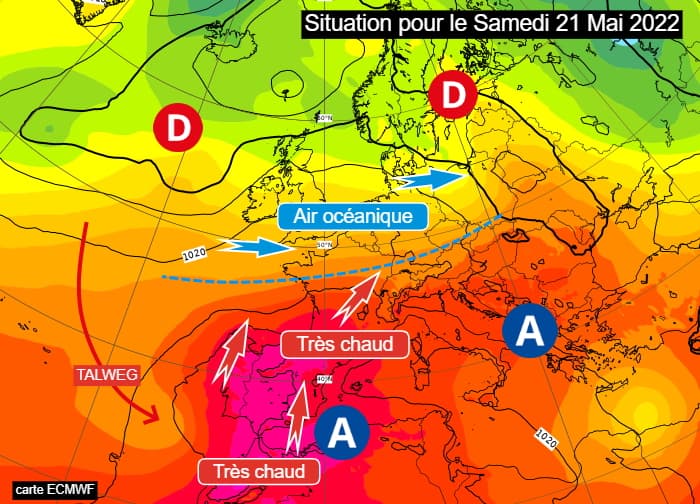 En fin de semaine, la configuration va évoluer. Les basses pressions nord-atlantiques vont réinvestir la Mer du Nord et la Scandinavie tandis que l'anticyclone résistera en Méditerranée. De plus, un talweg plongera au large du Portugal, servant de pompe à chaleur sur l'Espagne. Une masse d'air africaine bouillante remontera sur la péninsule ibérique et atteindra le sud de la France pour le week-end des 21 et 22 mai 2022. En revanche, le nord du pays sera influencé par l'air océanique (en marge des basses pressions britanniques) avec un air sensiblement plus respirable.