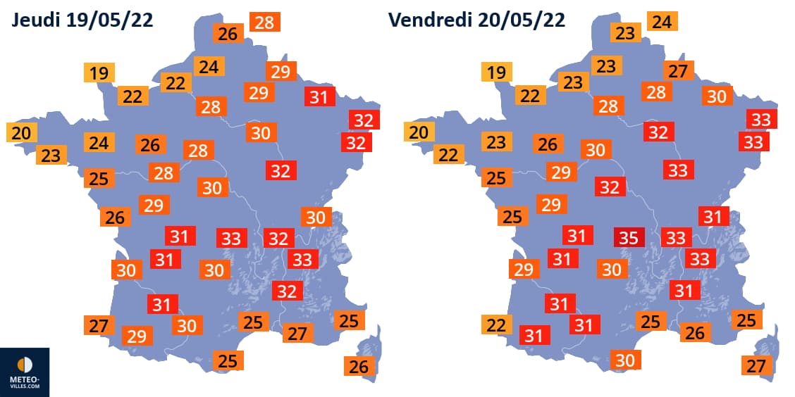 Températures maximales prévues les jeudi 19 et vendredi 20 mai 2022 - Météo Villes