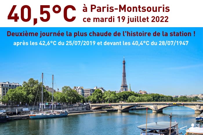 Ce mardi 19 juillet 2022 fut également historique à Paris. Avec une température maximale de 40,5°C à Montsouris, cette journée est devenue la deuxième plus chaude de l'histoire de la station ! Cette valeur devance les 40,4°C du 28 juillet 1947 ! Seul le 25 juillet 2019 fut plus chaud avec une maximale de 42,6°C.