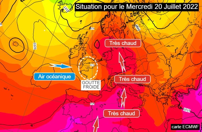 La goutte froide ayant soulevé un air bouillant sur la France au cours des deux derniers jours va survoler le nord-ouest de l'hexagone et la Manche ce mercredi 20 juillet 2022. Celle-ci induira une infiltration d'air océanique par l'ouest du territoire. Au contact avec l'air très chaud encore présent dans le sud et l'est, la masse d'air se déstabilisera avec un risque d'averses et d'orages.