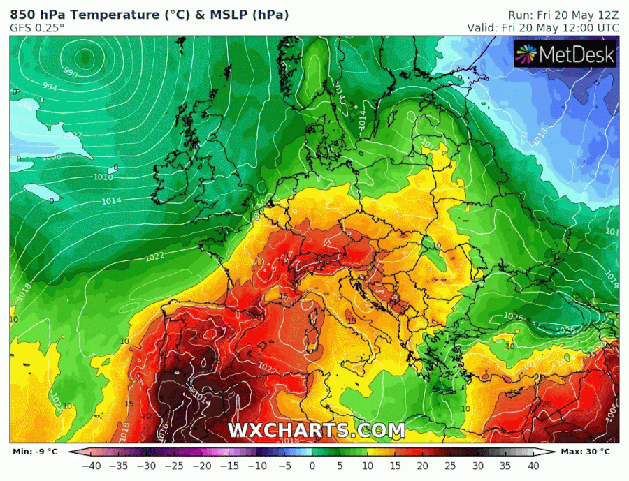 L'animation des anomalies de la masse d'air permet d'identifier ce dôme de chaleur entre le nord du Maghreb et le sud de la France, trouvant son paroxysme sur l'Espagne où la température de la masse d'air se trouve en moyenne 10 à 15°C au dessus des normales cette semaine ! Cela résulte de températures à 850 hPa (vers 1500m) généralement comprises entre 20 et 25°C, des niveaux dignes des canicules estivales, alors que nous ne sommes qu'en mai ! Dans le sud de l'Espagne, les 40°C ont été dépassés ce 20 mai 2022 !