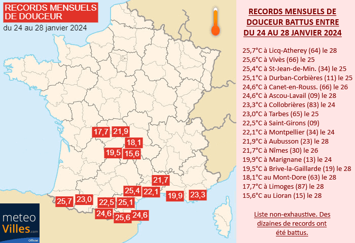 Entre le mercredi 24 et le dimanche 28 janvier 2024, ce sont des dizaines de records de douceur (voire de chaleur) pour un mois de janvier qui ont été battus dans le sud et le centre de la France, particulièrement sur les départements pyrénéens et méditerranéens ainsi que vers le Massif Central. Le dimanche 28 janvier 2024, on a relevé 25,7°C à Licq-Athérey (64) ! Le 25, il avait fait jusqu'à 25,6°C à Vivès dans les Pyrénées-Orientales ! Avec une masse d'air record, les températures se sont aussi envolées en montagne avec 20,7°C à Formiguères à 1500 mètres ! Le Massif Central n'y a pas échappé avec une pluie de records le 28. On a pu relever 21,9°C à Aubusson dans la Creuse et même 18,1°C au Mont-Dore (63) à 1220 mètres !