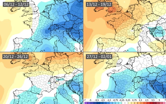 Le modèle européen envisage des températures proches des normales sur l'ouest de la France durant la semaine du 6 au 12 décembre 2021 tandis que des anomalies froides resteraient au programme sur le nord et l'est du territoire. La mi-décembre pourrait ensuite être dans les normales avant qu'une nouvelle tendance froide ne se dessine au cours de la dernière décade du mois, s'affirmant pour les derniers jours de l'année 2021.