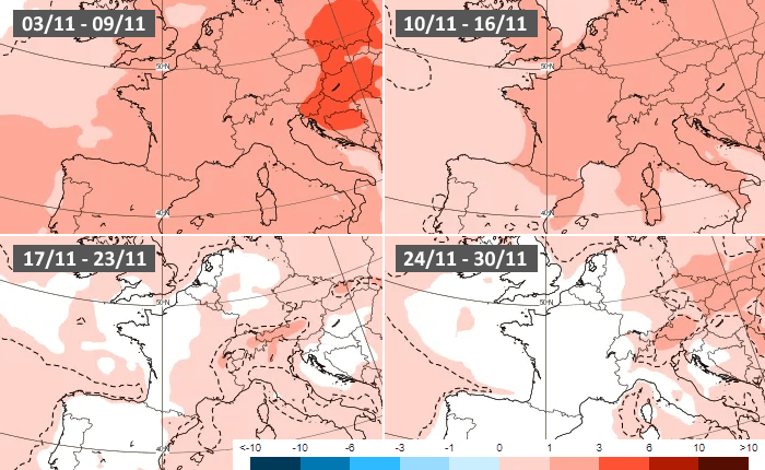 Anomalies thermiques hebdomadaires en novembre 2025 - modèle européen via ECMWF