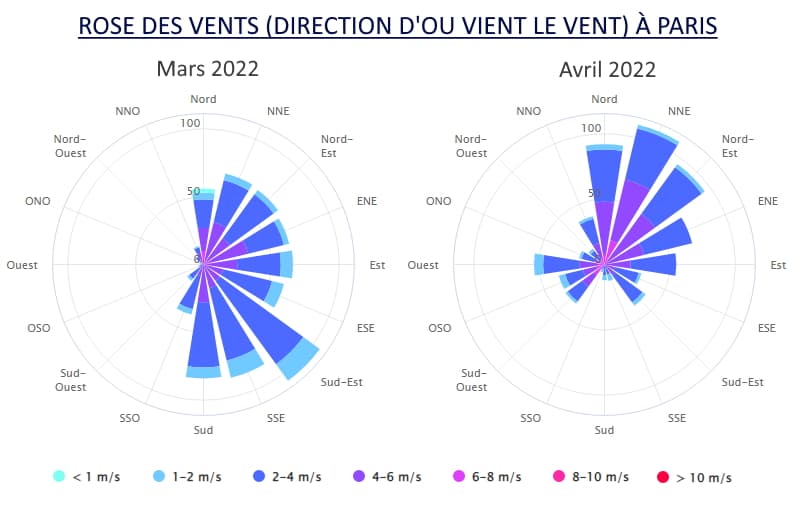 Roses des vents à Paris au cours des mois de mars et avril 2022 - via infoclimat.fr
