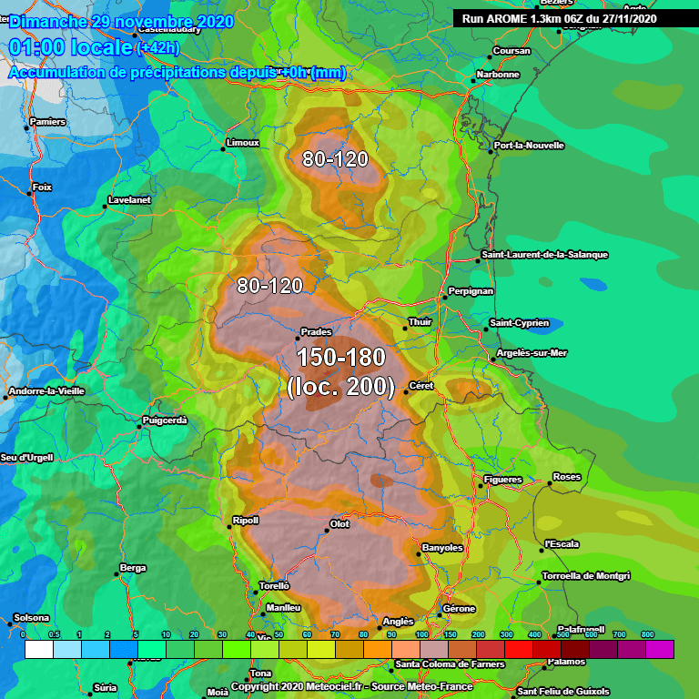 Ces intensités vont perdurer durant une bonne partie de la journée de Samedi sur l’Est des Pyrénées, plutôt Dimanche matin sur l’Est de la Corse. Ainsi, les cumuls vont devenir importants sur ces deux zones, atteignant localement 80 à 120mm sur les Corbières, 100 à 150mm sur Les Fenouillèdes et parfois 180-200mm près du Canigou.