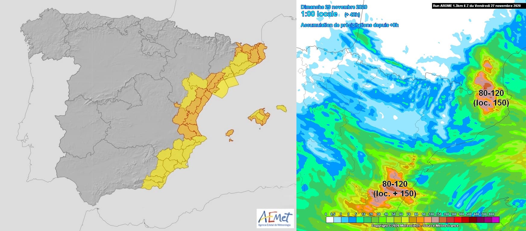 Vigilance orange pour fortes pluies/orages sur la côte Est de l'Espagne et cumuls envisagés par les modèles de prévision - Modèle Arome via météociel.fr et vigilance via AEMET