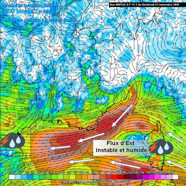 Avec l’approche du centre dépressionnaire par le Sud, ce flux va peu à peu devenir instable et humide avec la remontée de fortes pluies orageuses sur ces deux secteurs. Si ces précipitations concernent pour le moment les reliefs (orographie), les fortes intensités vont peu à peu gagner les plaines du Sud de l’Aude, des Pyrénées-Orientales et de la Corse à partir de la soirée de ce Vendredi.