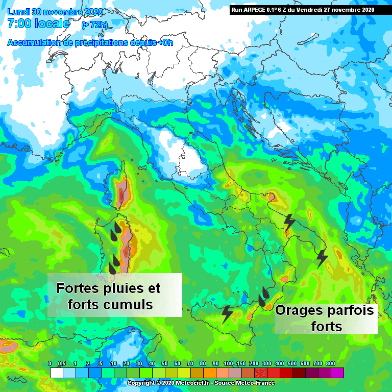 Au total, d’ici Dimanche matin, les cumuls pourront atteindre 180 à 220mm (loc. + de 250mm) sur les contreforts Est des reliefs Corses, notamment du Sud de Corte à Quenza, parfois 80 à 150mm sur le piémont et les plaines intérieures et entre 40 et 70mm en général sur la bande littorale, possiblement un peu plus sur le littoral Sud (région de Porto-Vecchio/Solenzara).
