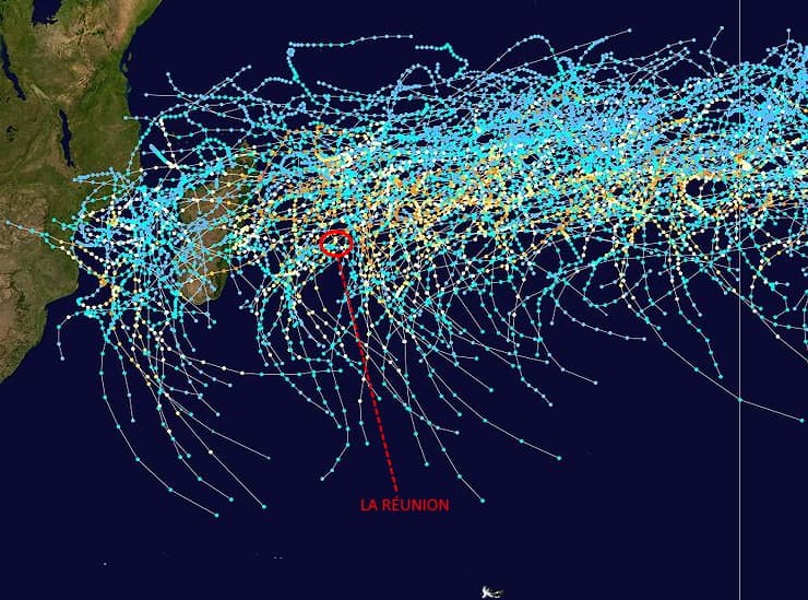 Dans l'océan Indien, la saison des cyclones s'étale surtout entre décembre et avril. C'est au cours des mois de janvier et de février et jusqu'au début du mois de mars que la Réunion est la plus exposée à ce risque. Le plus souvent, les cyclones tropicaux se forment à l'est de l'île qui peut alors se trouver sur leur trajectoire mais il arrive aussi que des phénomènes naissent à proximité de la Réunion.