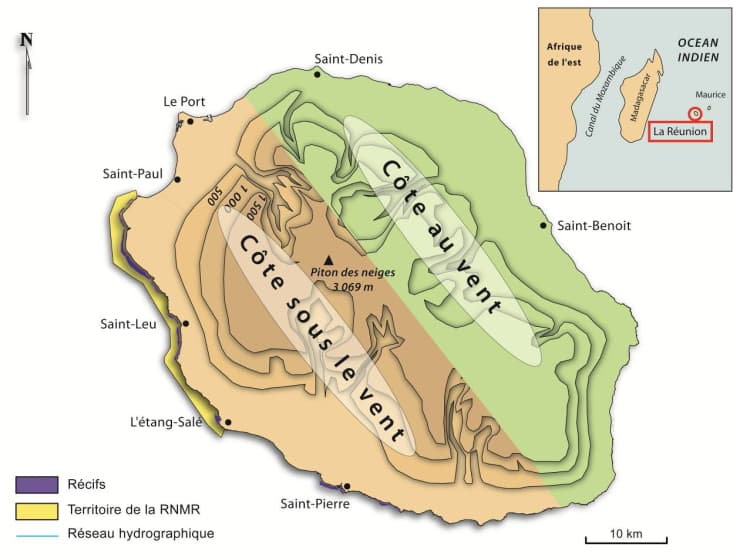 Carte du relief de la Réunion et distinction de la côte au vent et de la côte sous le vent - via A. Lemahieu