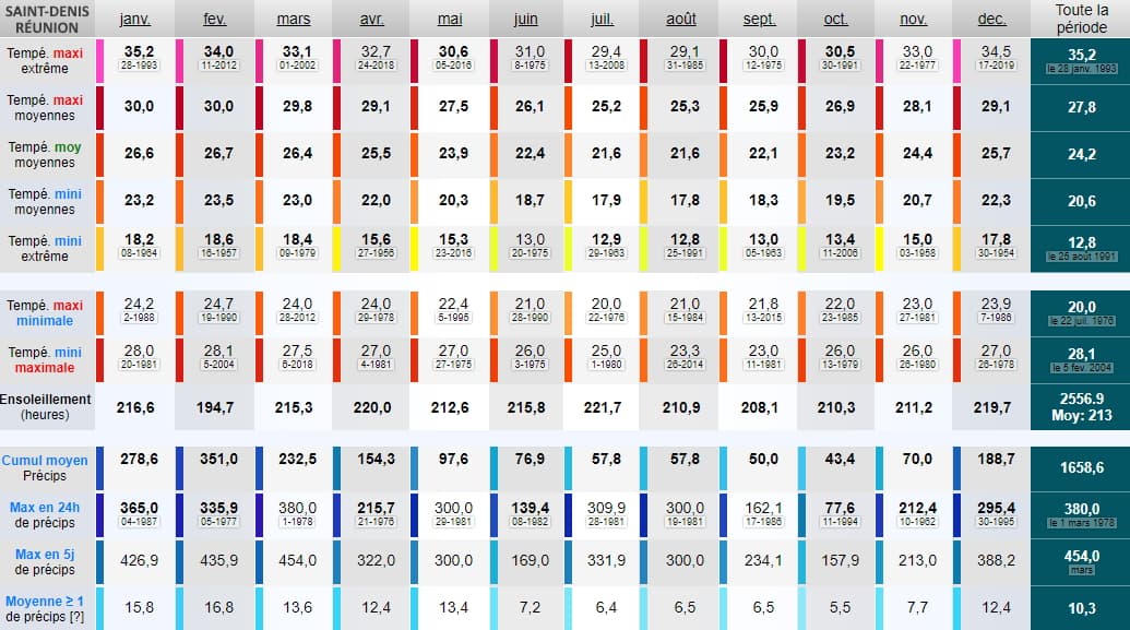 Tableau des normales climatiques à Saint-Denis de la Réunion - via Infoclimat