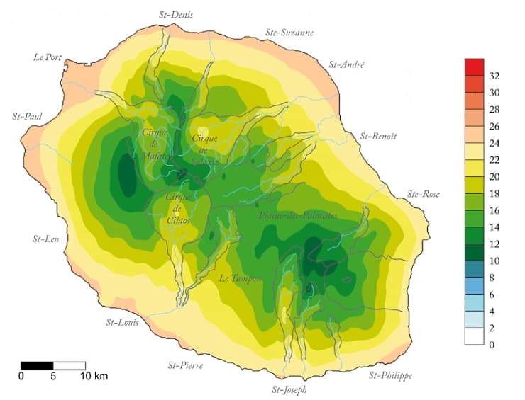 Températures annuelles moyennes à la Réunion - via Météo France