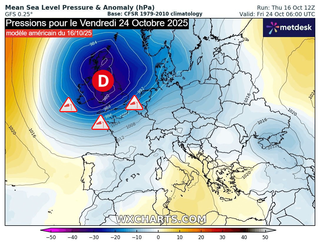 Pour l'heure, il n'est pas possible de faire la moindre affirmation car les coups de vent ou tempête sont difficilement prévisibles à une échéance d'une semaine. Toutefois, on peut identifier que l'environnement deviendra favorable autour de jeudi ou vendredi prochains. D'ailleurs, certains modèles réagissent et projettent une dépression britannique très active à l'horizon des 23-24 octobre 2025. Au sud de celle-ci, les vents pourraient souffler très fort sur le nord de la France et notamment en Manche, même s'il est beaucoup trop tôt pour en dire plus.