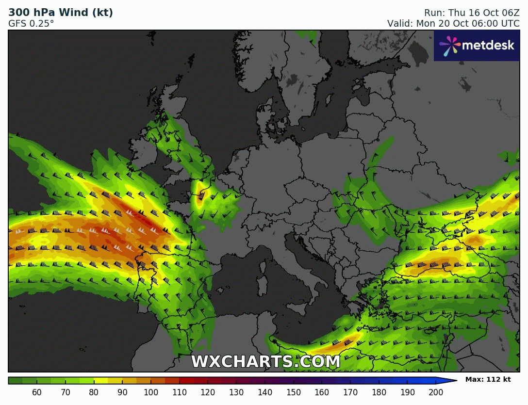 Vitesse du courant jet d'altitude du lundi 20 au vendredi 24 octobre 2025 - wxcharts.com