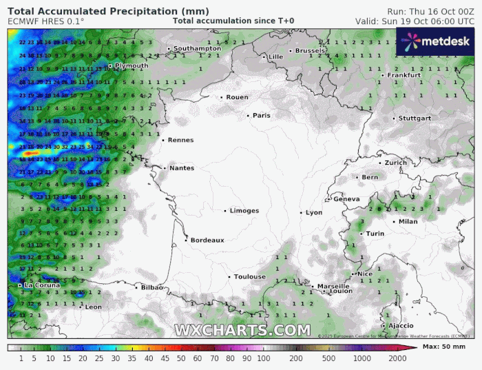 Cumuls de pluie modélisés du dimanche 19 au dimanche 26 octobre 2025 - wxcharts.com