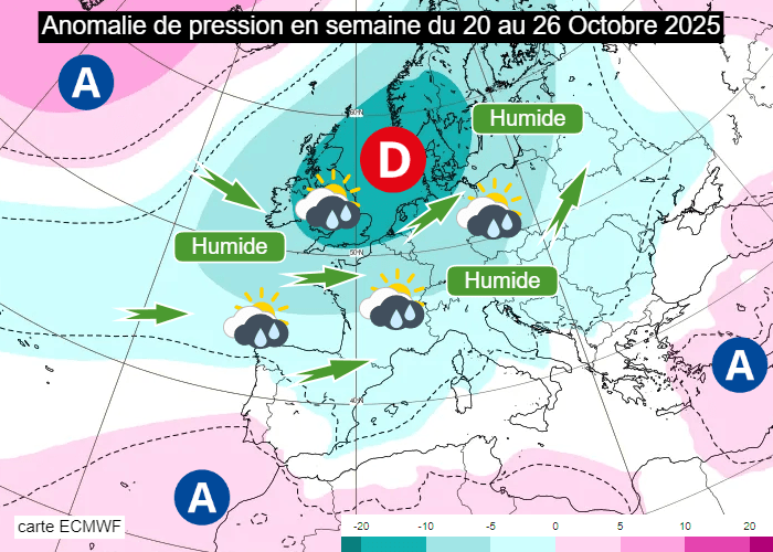 C'est la fin du blocage anticyclonique. Le courant océanique perturbé reprendra du service dès ce dimanche 19 octobre 2025. La semaine prochaine - du 20 au 26 octobre - sera dominée par les basses pressions en France, lesquelles seront particulièrement actives entre les Îles Britanniques, la Mer du Nord et le sud de la Scandinavie. Notre pays se trouvera en flux de sud-ouest dépressionnaire, apportant avec lui un défilé de perturbations pluvieuses.