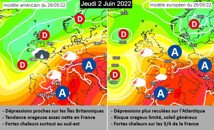 Comparatif entre les modèles américain & européen pour le jeudi 2 juin 2022 - via meteociel.fr