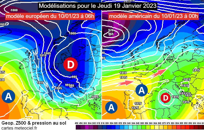 Comparaison entre les modèles européen et américain pour le jeudi 19 janvier 2023 - via meteociel.fr