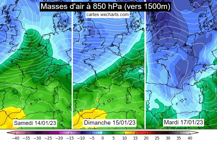 Masses d'air à 850 hPa (vers 1500) du 14 au 17 janvier 2023 - modèle européen via wxcharts.com