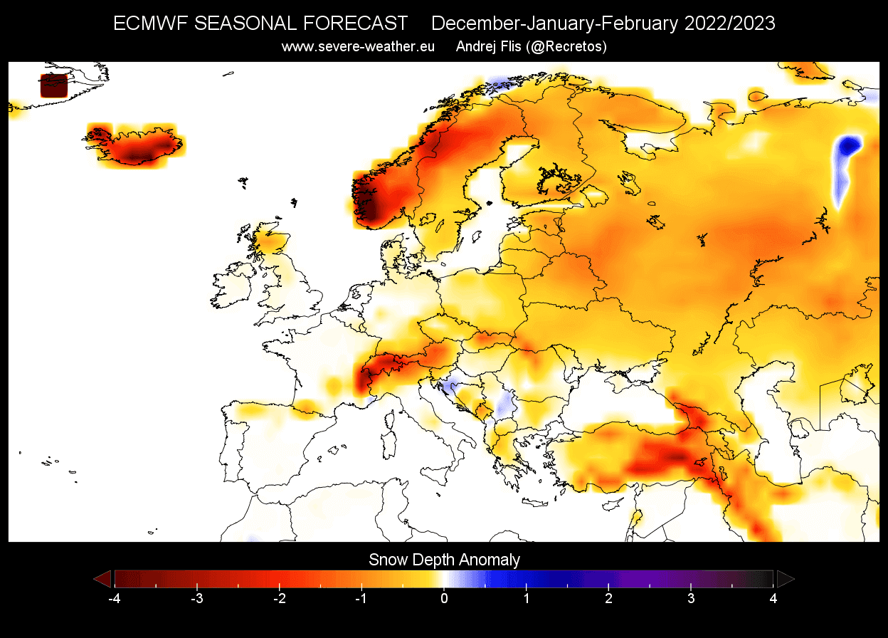 Anomalies d'épaisseur de neige sur l'Europe durant l'hiver 2022/2023 – ECMWF/Severe-weather.eu