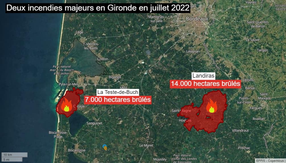 Carte des superficies détruites par les incendies en Gironde - via EFFIS / Copernicus