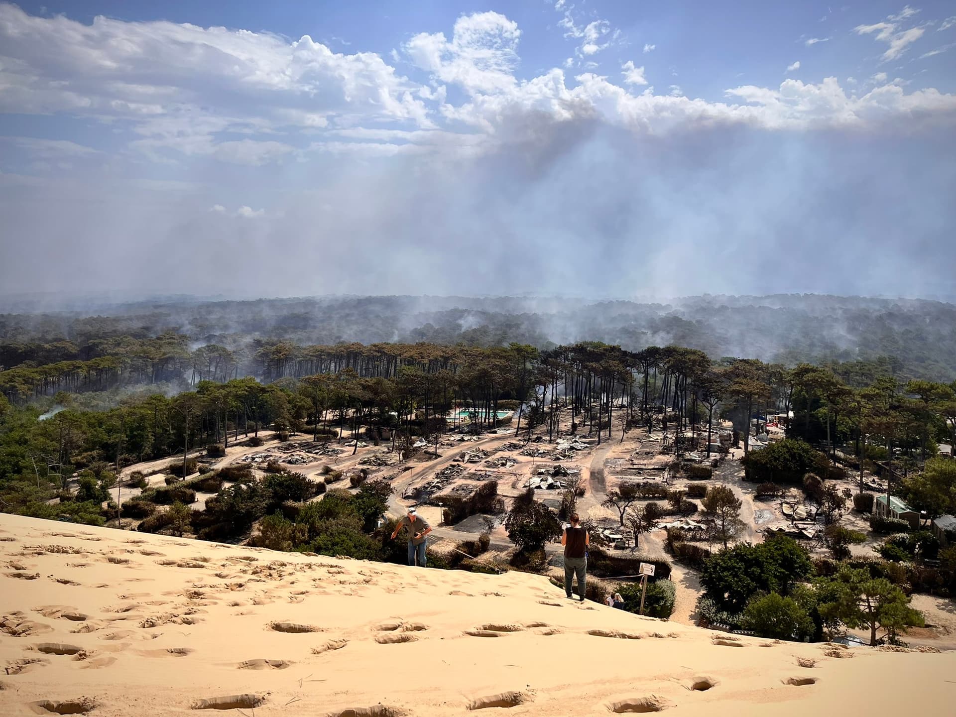 L'incendie de la Teste-de-Buch a marqué les esprits en détruisant 7.000 hectares de forêt durant une semaine ! Le feu a frappé des zones très touristiques, finissant par atteindre les plages de l'océan et arrivant jusqu'au pied de la célèbre Dune du Pilat. De nombreux campings ont été évacués et ces évacuations se sont avérées particulièrement nécessaires puisque les cinq campings situés au pied de la dune - dont le célèbre camping des Flots Bleus - ont été détruits à 90% par les flammes !