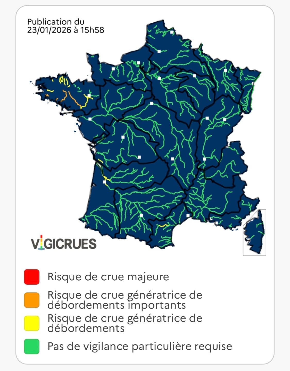 Les pluies s’annoncent particulièrement intenses sur les régions de l’Ouest et du pourtour méditerranéen, mais aucune région ne sera réellement épargnée. Les nappes phréatiques, déjà saturées dans de nombreux bassins de l’Ouest, du Nord et près de la Méditerranée, accentuent le risque de crues rapides. Plusieurs cours d’eau pourraient ainsi sortir de leur lit dans les prochains jours.